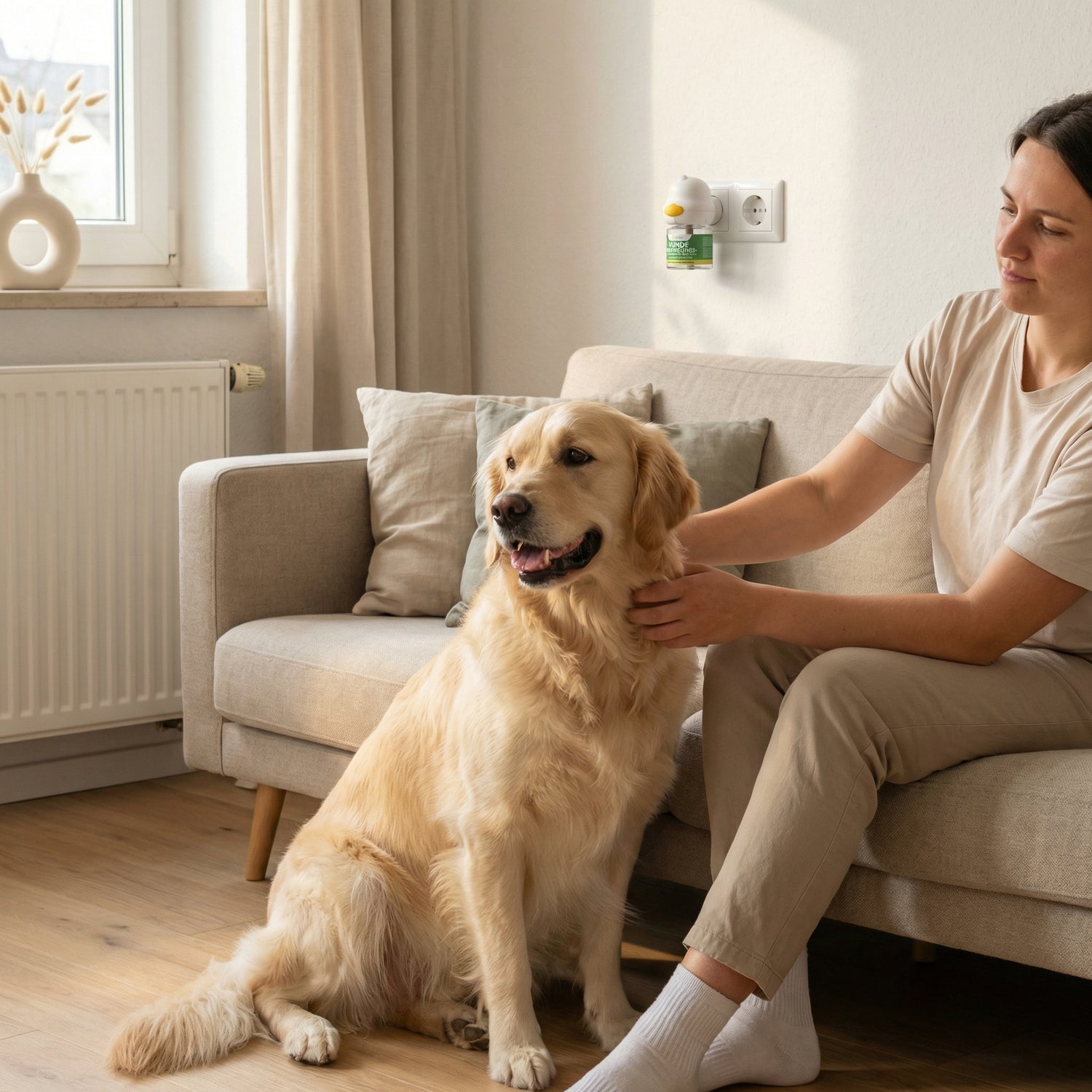 Platziere ihn in dem Raum, in dem dein Hund die meiste Zeit verbringt. Vermeide Steckdosen direkt an Fenstern, Türen oder Luftschächten, weil Zugluft die Verteilung im Raum stören kann.